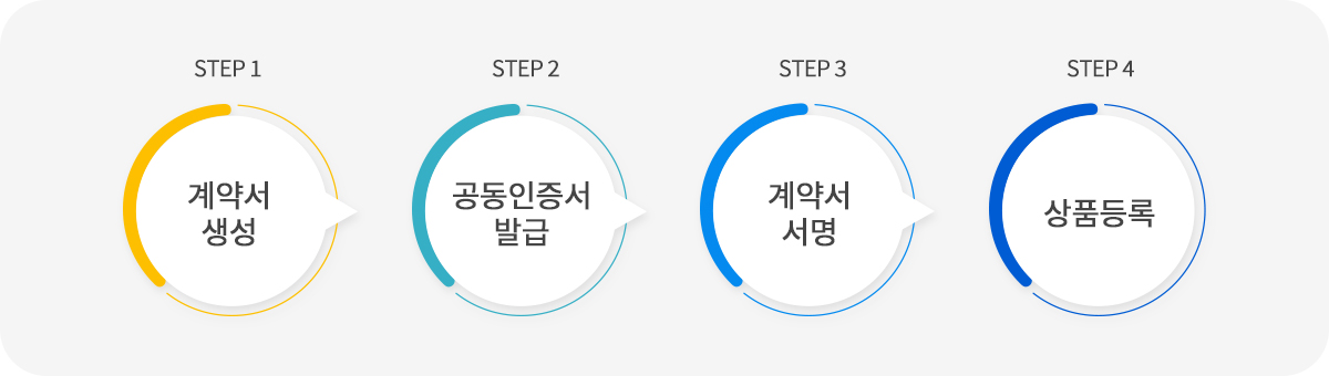 공동인증서 발급 - 계약서 서명을 위한 공동인증서 발급 (사업자용 범용공동인증서) 계약서 서명 - 계약서 확인 후 공동인증서로 서명하여 계약 완료 - 계약 시작일 1일 전까지 협력사 미승인 시, 계약서 폐기 상품등록 - 계약 체결 완료 후 상품 등록 및 판매 진행